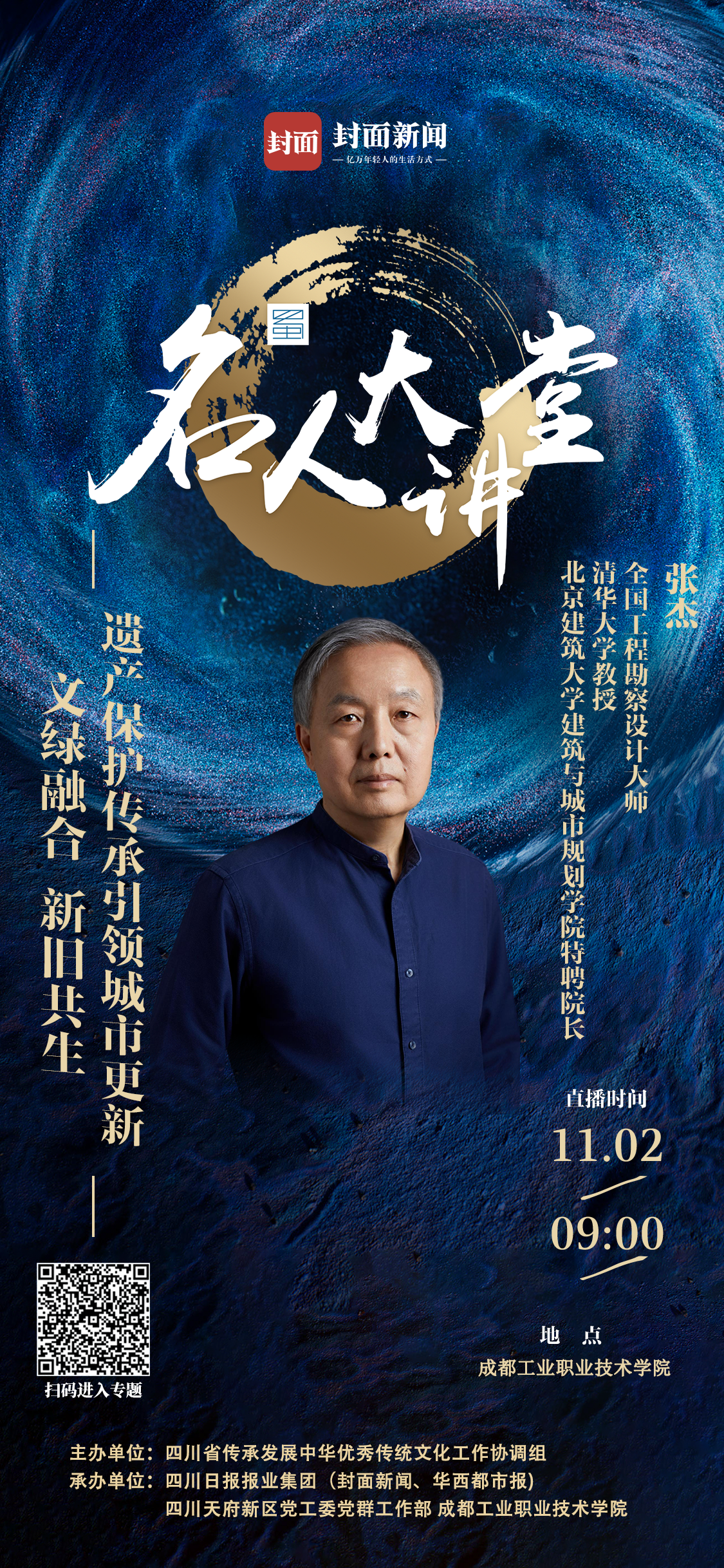 11月2日上午9点,全国工程勘察设计大师,清华大学建筑学院教授、北京建筑大学建筑与城市规划学院特聘院长张杰,将做客2025名人大讲堂“遗产保护”季,在成都工业职业技术学院带来题为《文绿融合 新旧共生:遗产保护传承引领城市更新》的主题讲座。